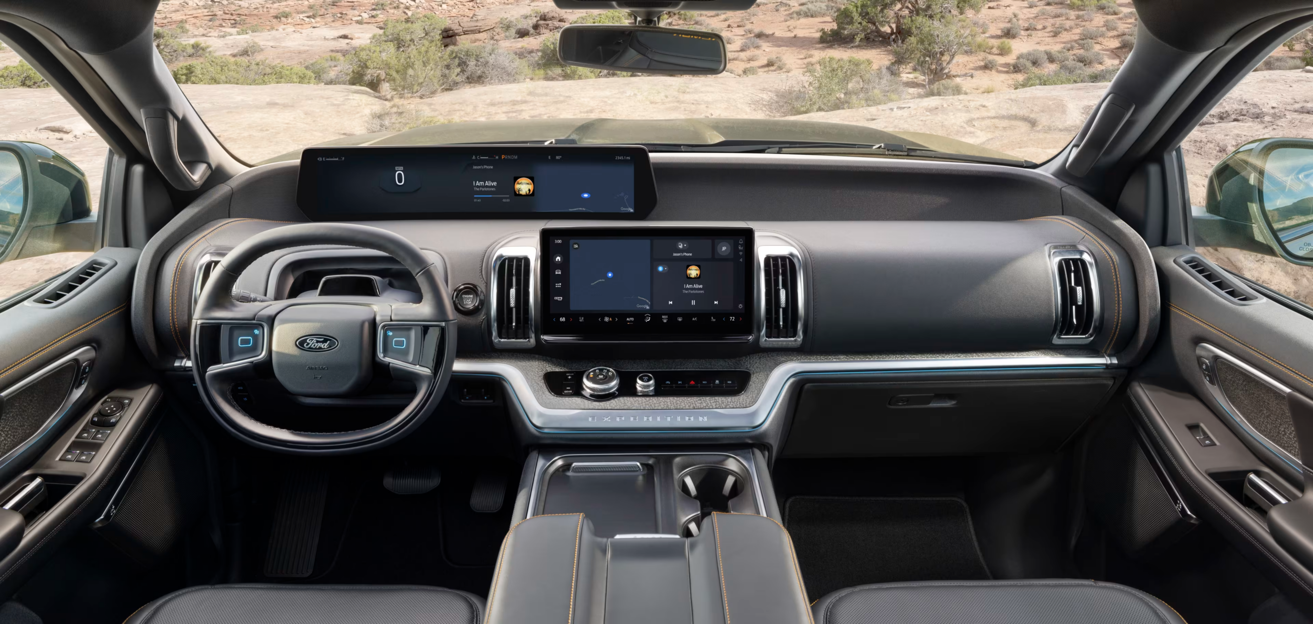 The interior of the 2025 Ford Expedition Tremor is massive: there is room all around, with plenty of space for cupholders, documents, luggage, you name it.
